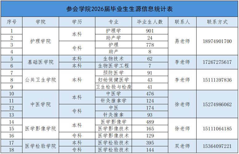 为加强用人单位与毕业生之间的交流和沟通,长沙医学院护理学院、公共卫生学院、医学检验学院、中医学院、医学影像学院、基础医学院六个学院预计在5月8日举办联合专场招聘会。借此良机邀请各医疗卫生单位莅临现场招贤纳士,具体安排如下:
